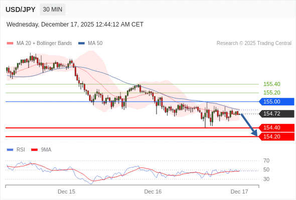 交易策略: 在 155.00 之下,看跌,目标价位为 154.40 ,然后为 154.20 。