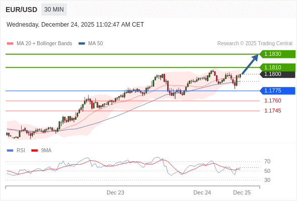 在 1.1775 之上,看涨,目标价位为 1.1810 ,然后为 1.1830 。