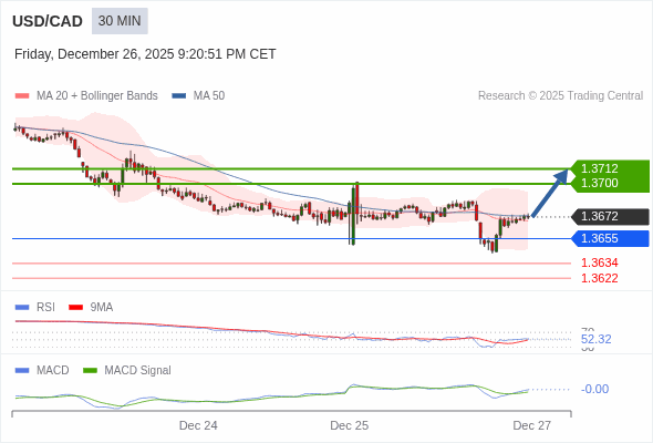 美元/加元 当日内 : 看涨。