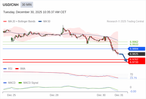 技术点评: RSI技术指标小于30。在这种情况下,说明有很强的下跌趋势,或者意味着处在超卖的状态下,可能会有向上的反弹。我们将观察RSI技术指标是否出现背离现象。 MACD技术指标处在其信号线之下看空。 配置为负。 此外,价位低于其20天及50天移动平均线 ( 分别位于6.9936 和6.9977 )。