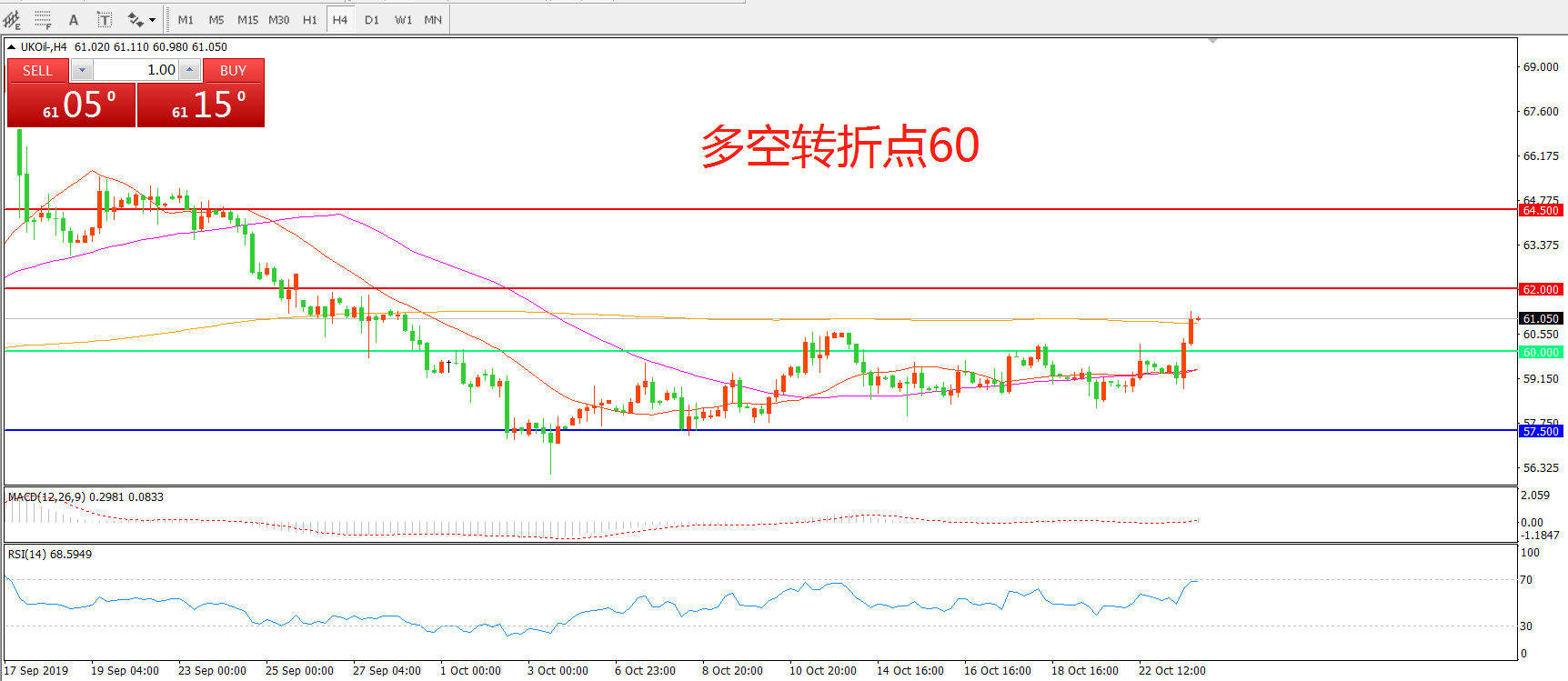 4小时图看,油价阳线连续反弹,突破前期阻力,整体走势偏强,200周期均线被突破,60美元成为下方支撑,MACD红柱增加,日内延续上行概率较大。