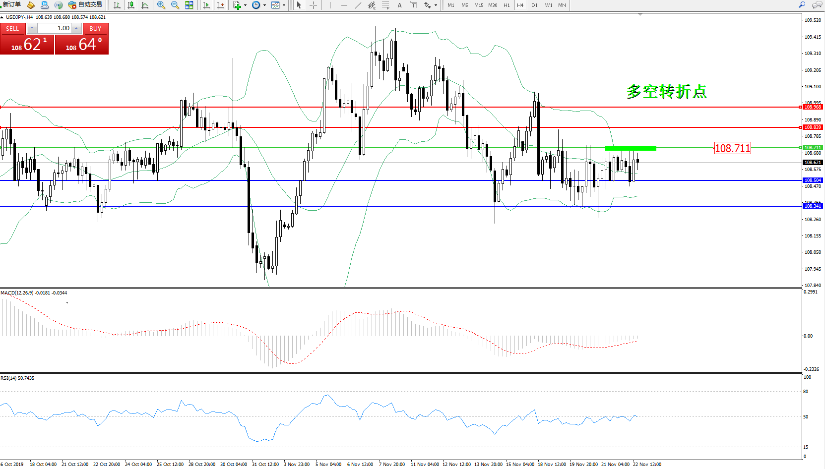 交易策略:108.711下方看跌,目标108.504、108.341
