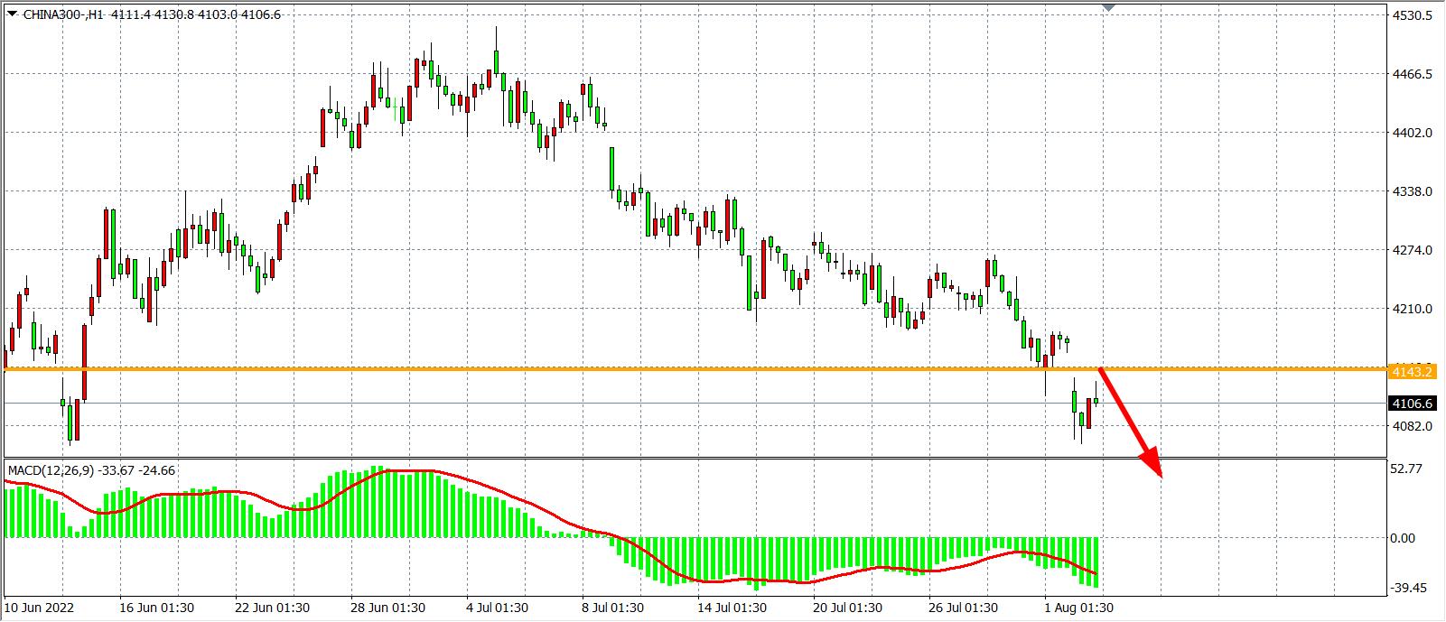 1小时图看,沪深300在4200之下延续跌势,跌势加速出现跳空缺口,目前阻力已下移至4143,日内在该位之下继续看跌为主,同时MACD于零轴之下量能持续放大,预示行情进一步回探的风险,在4143之下看4050-4000
