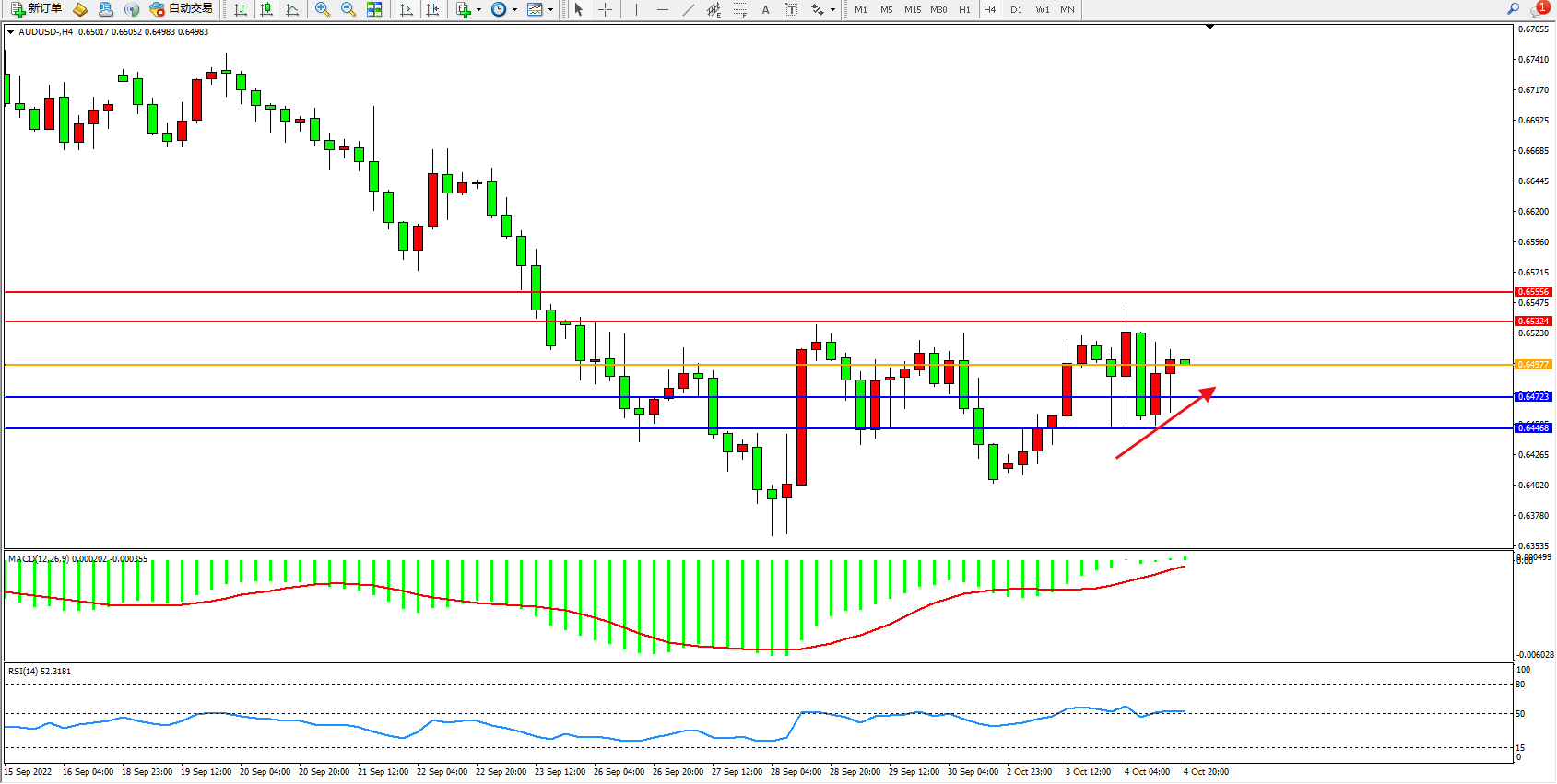 澳元美元AUDUSD——4小时K线图显示: