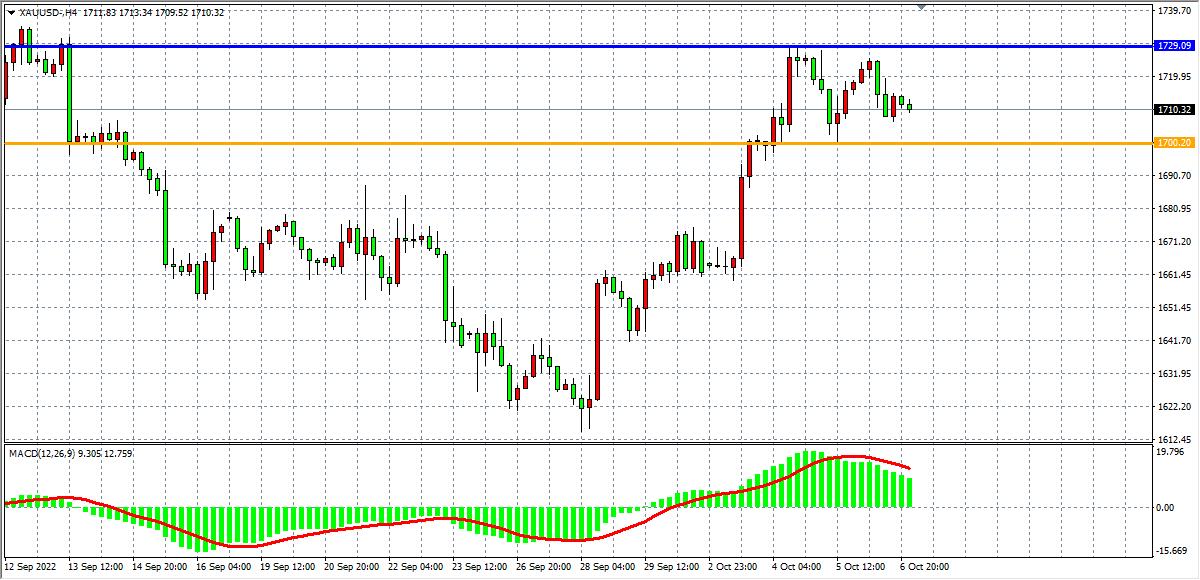 4小时图看,金价再度反弹至前高点1729附近出现冲高回落,形成二次受阻,MACD于零轴之上小幅缩量,显示多头趋势有所减弱。目前支撑主要集中于1700一线,上方阻力1729,形成短期箱体。