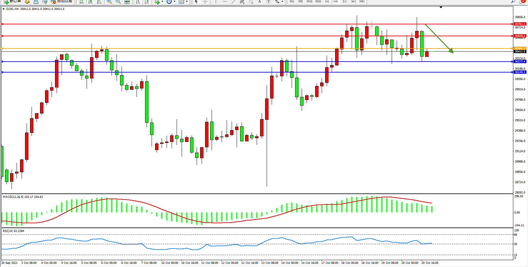 道琼斯指数DJ30——4小时K线图显示: