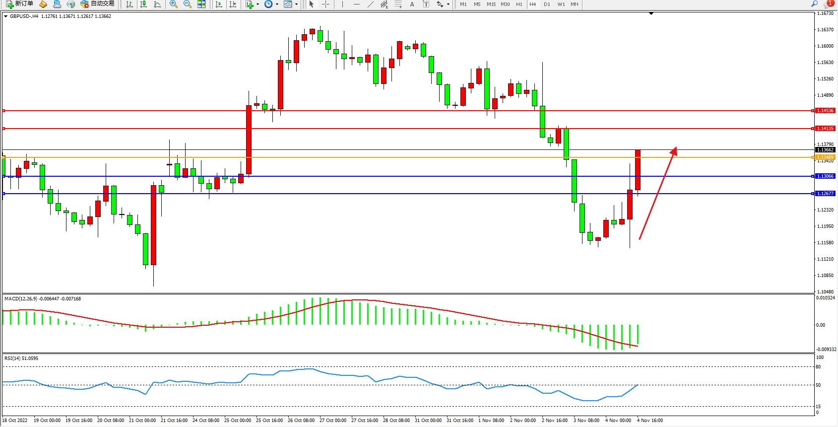 交易策略:1.13489上方看涨,目标1.14135、1.14536
