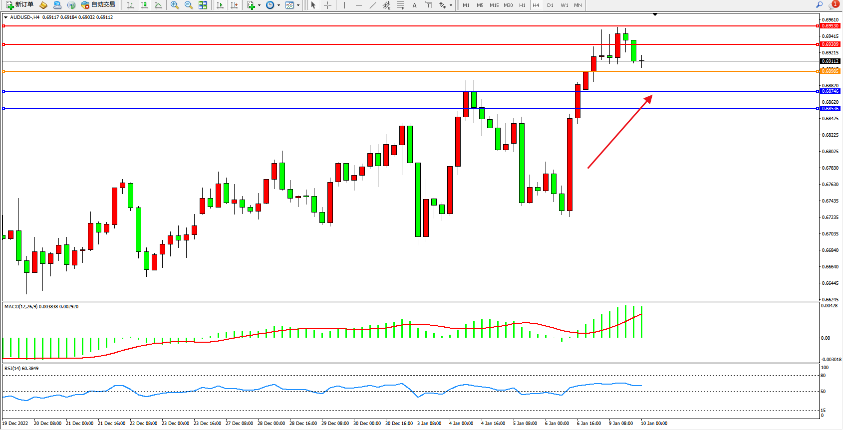 澳元美元AUDUSD——4小时K线图显示: