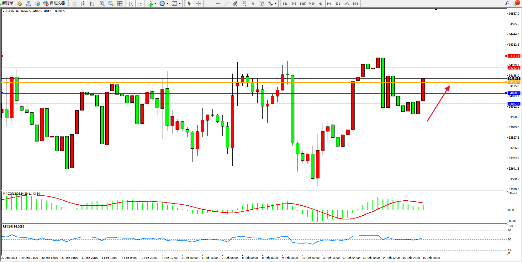 道琼斯指数DJ30——4小时K线图显示: