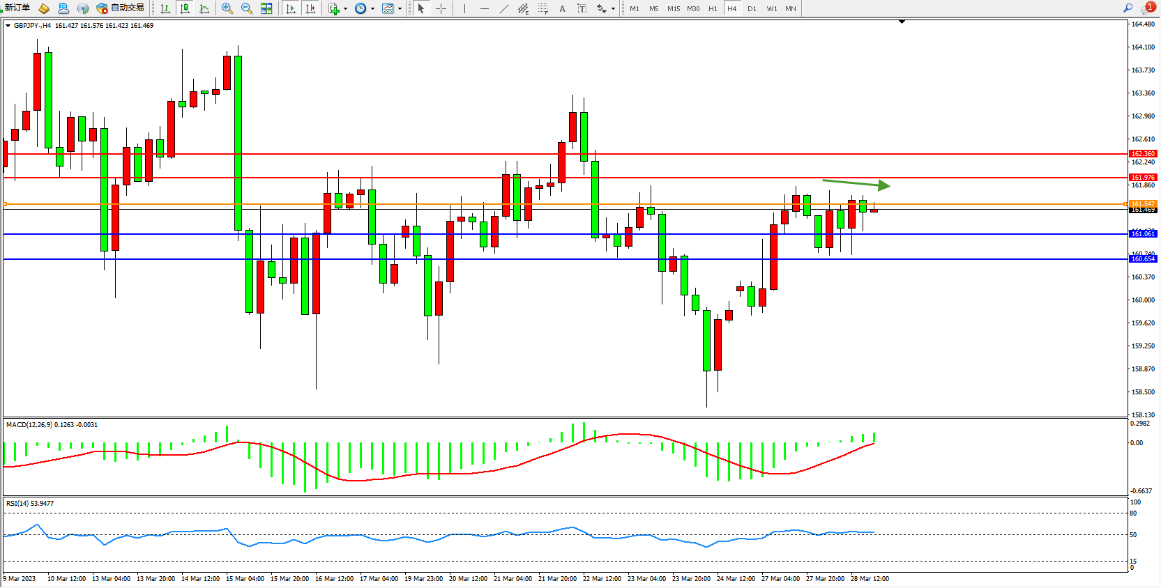 4小时图看:多头动力震荡上扬后窄幅整理,市场整体处于看涨趋势,但后续动力有所欠缺,MACD指标处于0轴线上側徘徊,RSI指标处于50均衡线上側弱势整理;