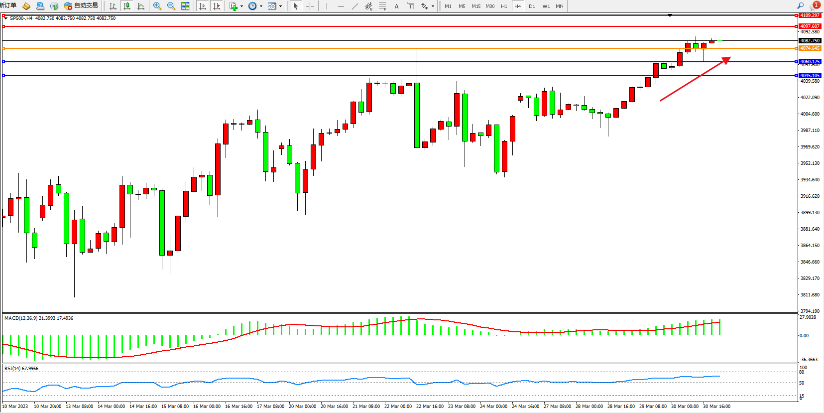 标普SP500——4小时K线图显示: