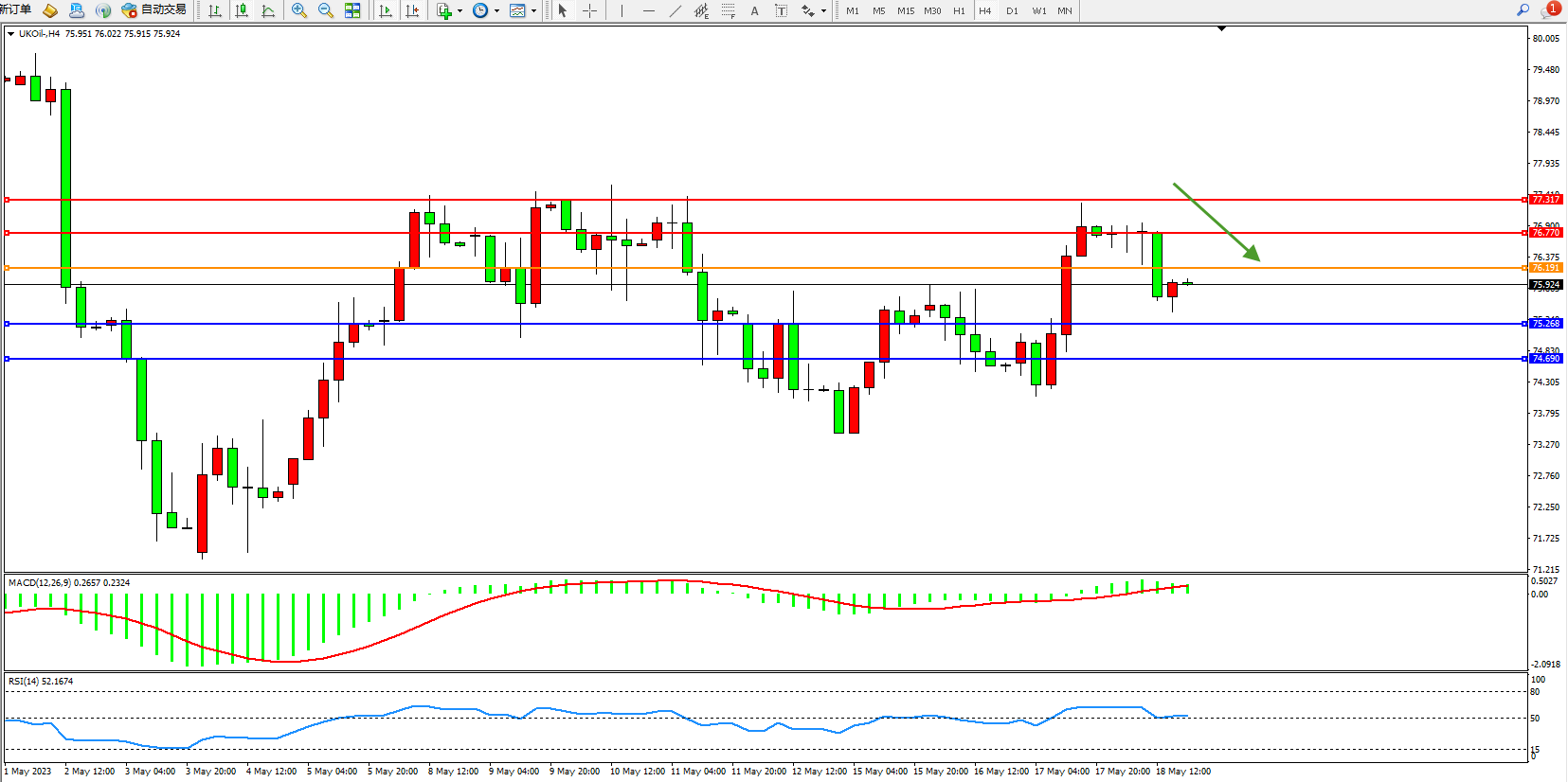 交易策略:76.191下方看跌,目标75.268 74.690