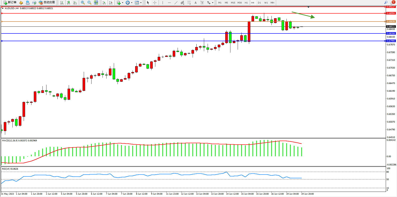 交易策略:0.68698下方看跌,目标0.68266 0.67995