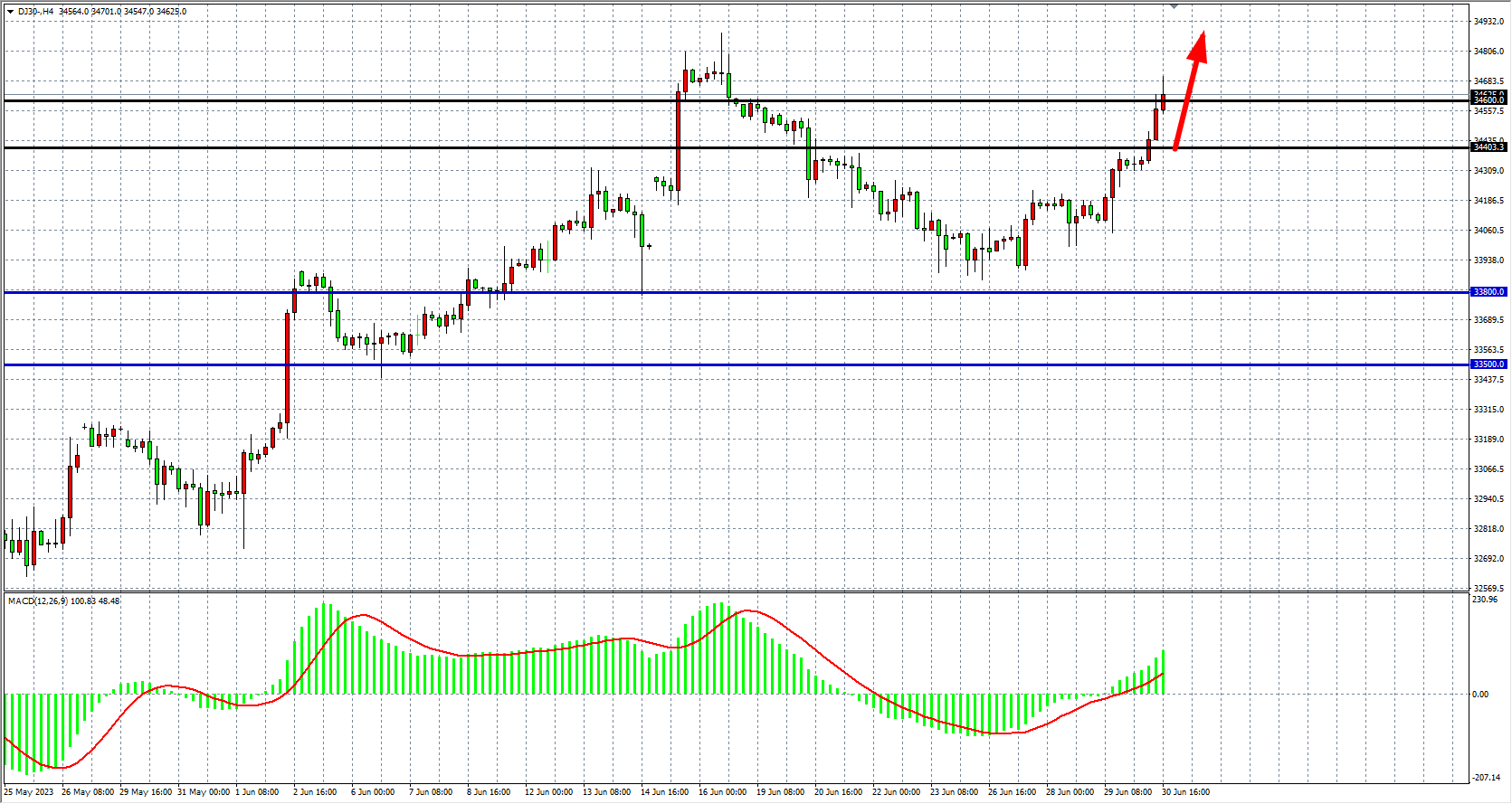 4小时图看,道指进一步突破34600,趋势继续延续涨势,MACD量能在零轴上维持放量,支撑关注34600-34400,上方关注35000关口阻力。