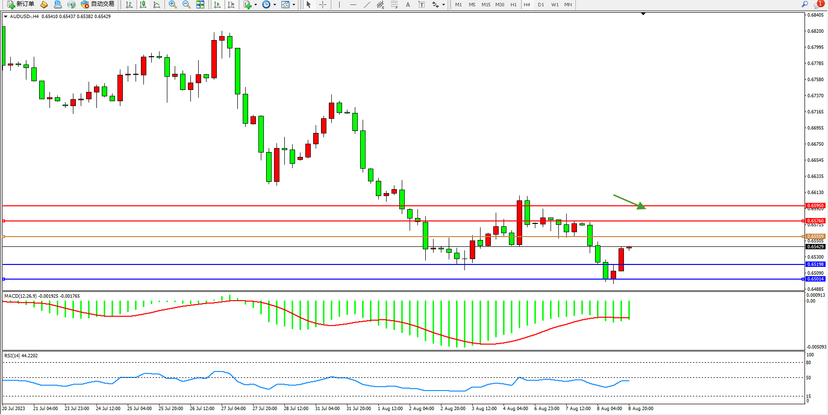澳元美元AUDUSD——4小时K线图显示: