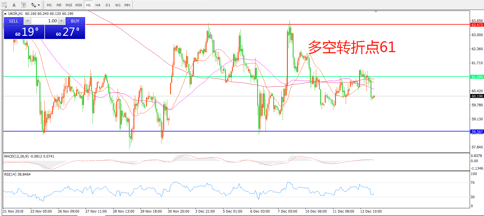 交易策略:在61.00之下看跌,目标58.00    55.00
