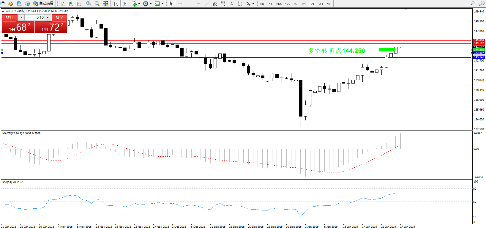 交易策略:144.250上方看涨,目标145.182、145.626