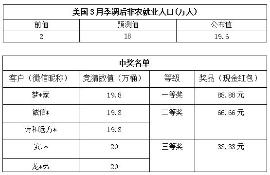 “3月份非农就业人数大竞猜”活动的中奖结果已出,获奖信息如下: