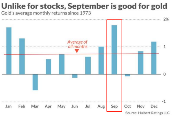 具体从统计来看,1973年黄金开始自由交易以来的数据,发现平均而言,9月份一直是黄金一年中表现最好的月份,黄金在9月份的平均回报率为1.8%,是所有月平均水平0.8%的两倍多。