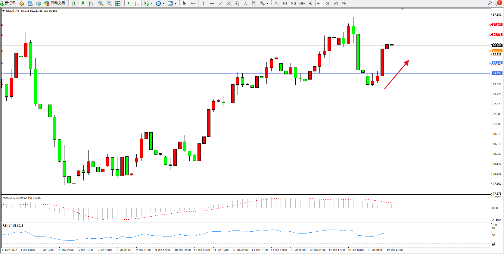 4小时图看:高位多头动力强势拉升,市场看涨情绪再度涌现,短期多头市场持续,MACD指标处于0轴线上侧徘徊,RSI指标处于50均衡线上侧窄幅整理;