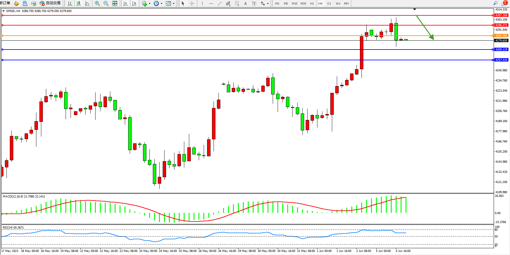 标普SP500——4小时K线图显示: